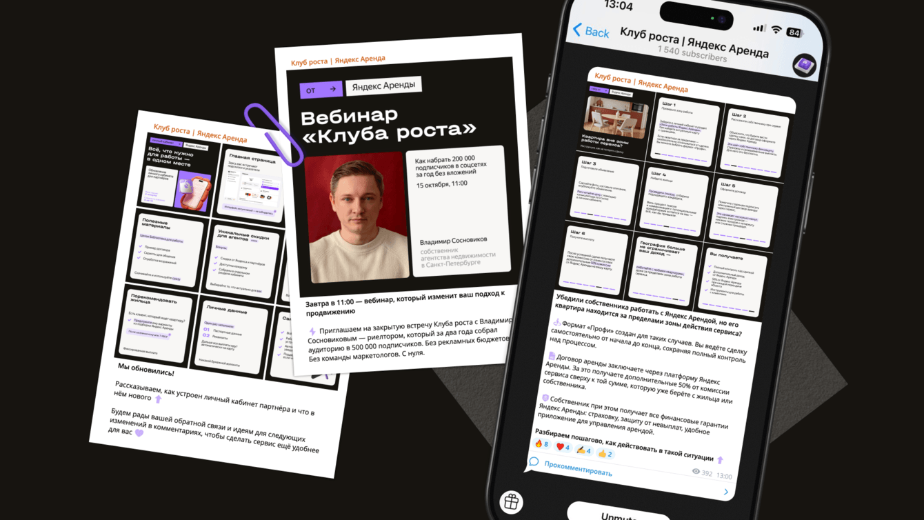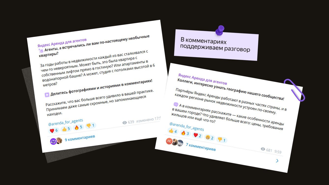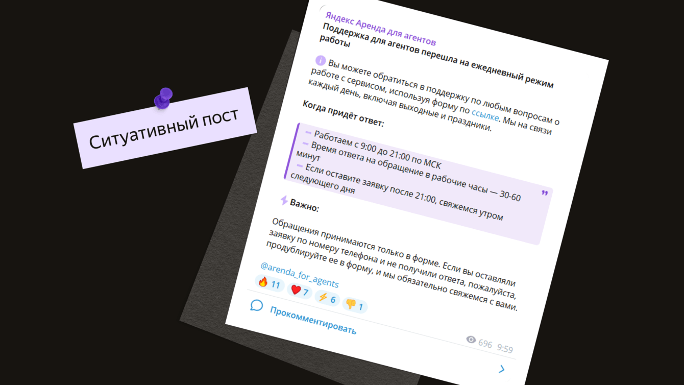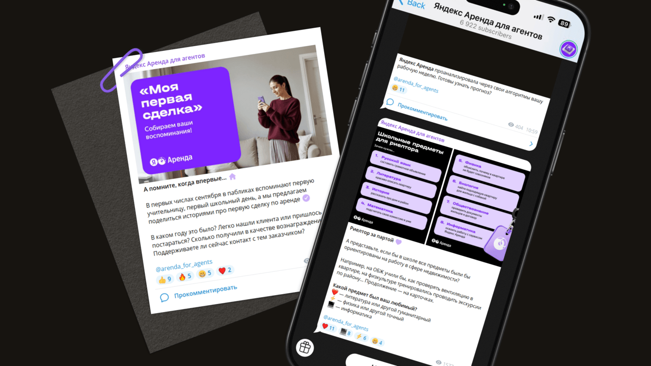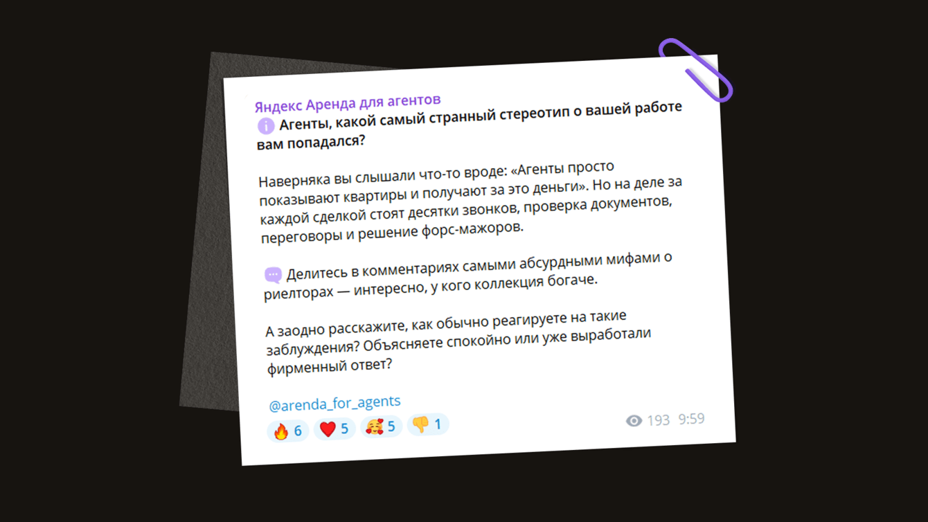 Через посты в канале «Яндекс Аренда для агентов» мы продвигаем идею, что сервис Яндекс Аренда — это инструмент, который автоматизирует рабочую рутину. Как бизнес использует 1С или Битрикс, так и риелторы могут использовать нишевый софт. Мы регулярно рассказываем, какие задачи можно через него решать.