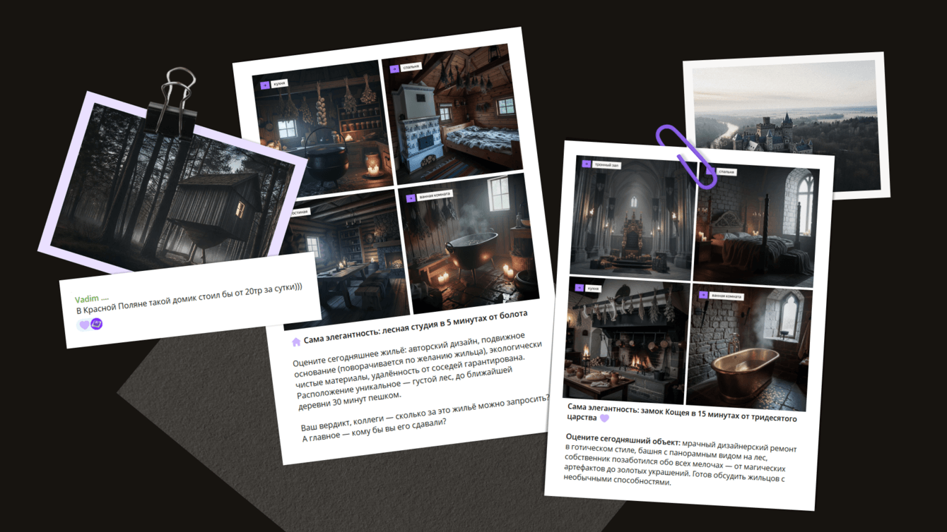 «Старый» формат, в котором предлагали оценить стоимость квартиры по фото, мы обыграли по-новому: сгенерировали через нейросеть картинки с интерьером недвижимости из сказок — избушка Бабы-Яги или замок Кощея, и предложили оценить подписчиков такой объект. В комментариях подписчик пошутил, что подобный домик мог бы сдаваться в Красной Поляне и стоить от 20К в сутки.
