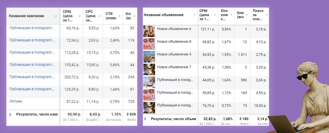 В таргетированной рекламе основной упор делался на развитие комьюнити и увеличение узнаваемости ресторанов сети - показать рекламу тем, кто еще не знаком с ресторанами сети, и напомнить о себе тем, кто давно не был. Значительная доля рекламных активностей приходилась на акционные предложения - скидки и спецпредложения, а также на летние террасы и афишу мероприятий.