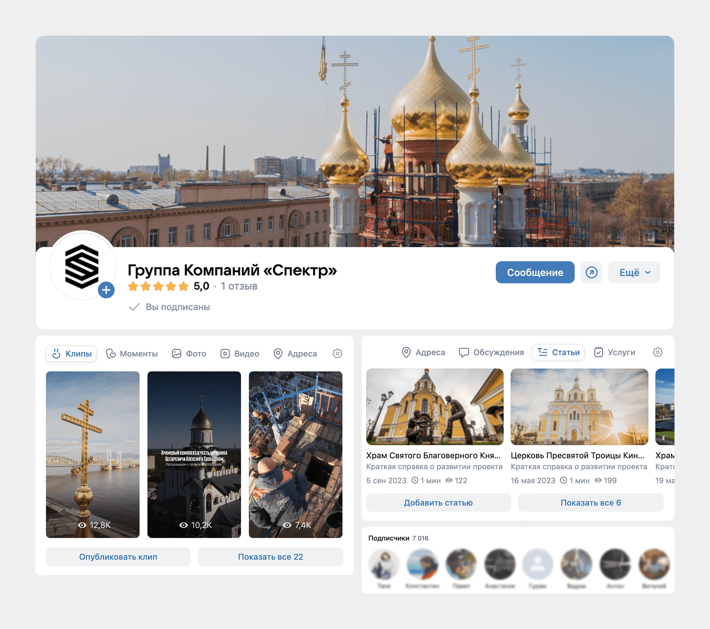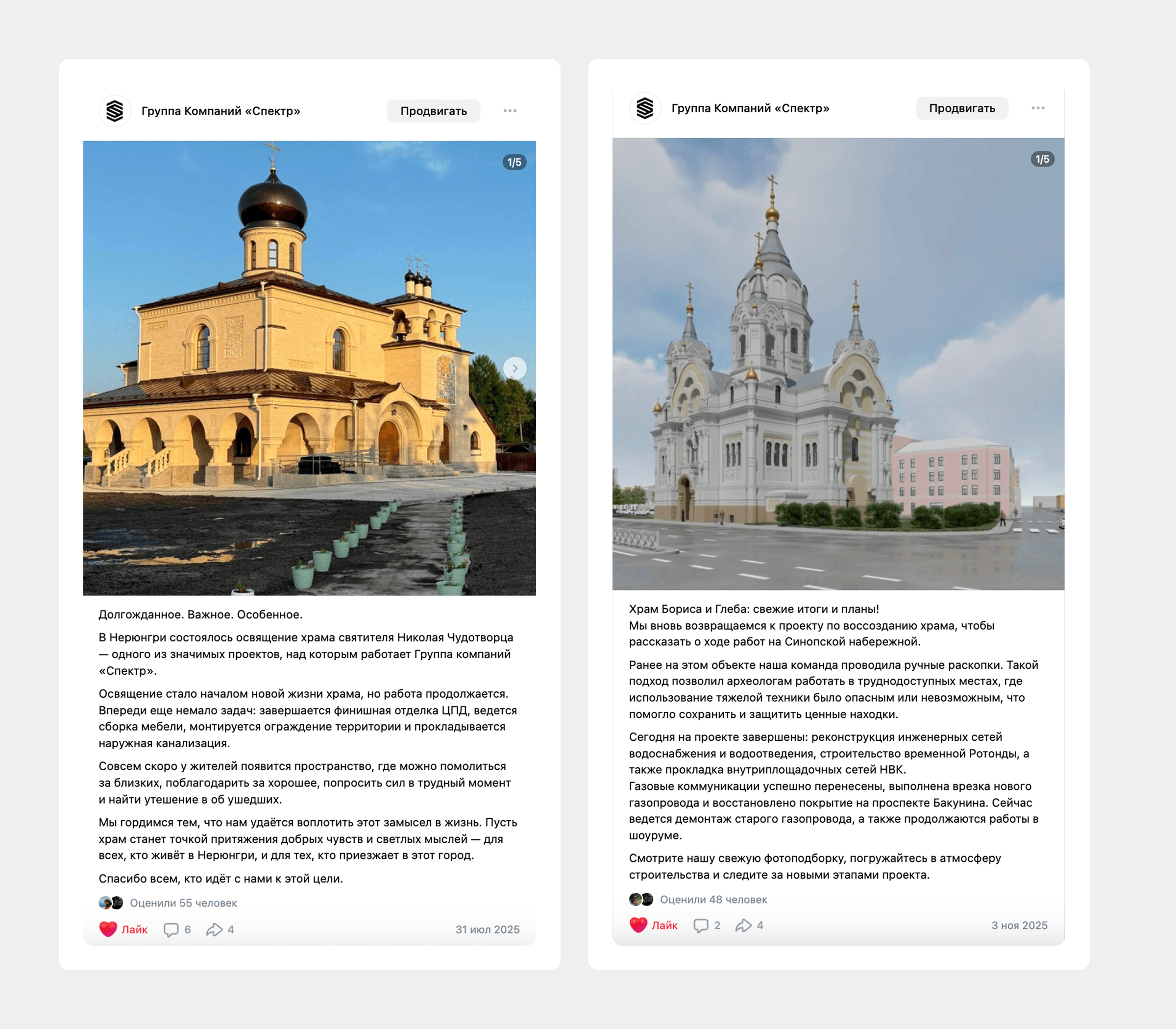 Главное достижение проекта — создание эмоциональной идентичности бренда в нишевой сфере. Соцсети Группы компаний «Спектр» популяризируют ценность православной архитектуры, превращают сложные процессы реставрации в понятные истории и формируют живое сообщество вокруг компании.