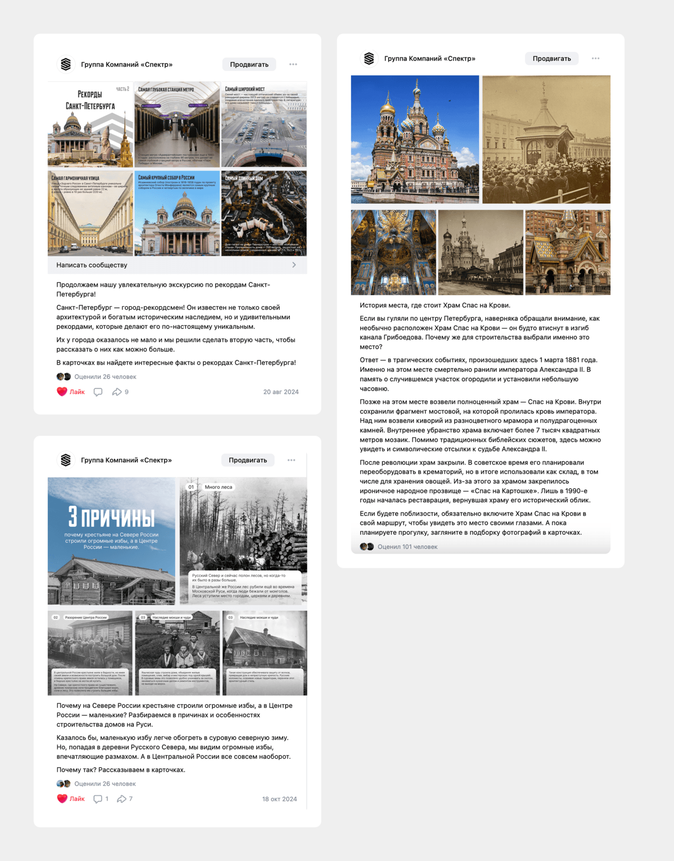 Социальные сети компании — точка встречи двух аудиторий: профессионалов, которым важны детали и процессы, и широкой аудитории, интересующейся историей, архитектурой и сохранением культурного наследия.