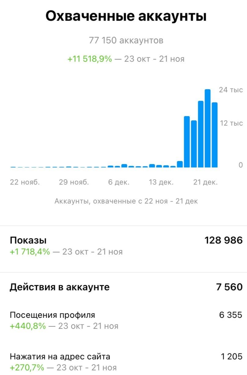 Охваты целевой аудитории через 3 месяца сотрудничества от 650 до 1000 пользователей на пост. Рост в 7 раз, а при использовании платной рекламы достигли охвата 11000 пользователей при не большом бюджете.
