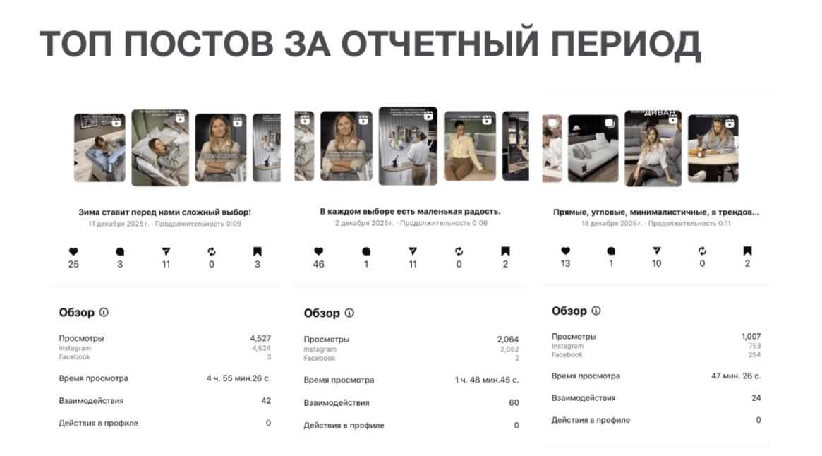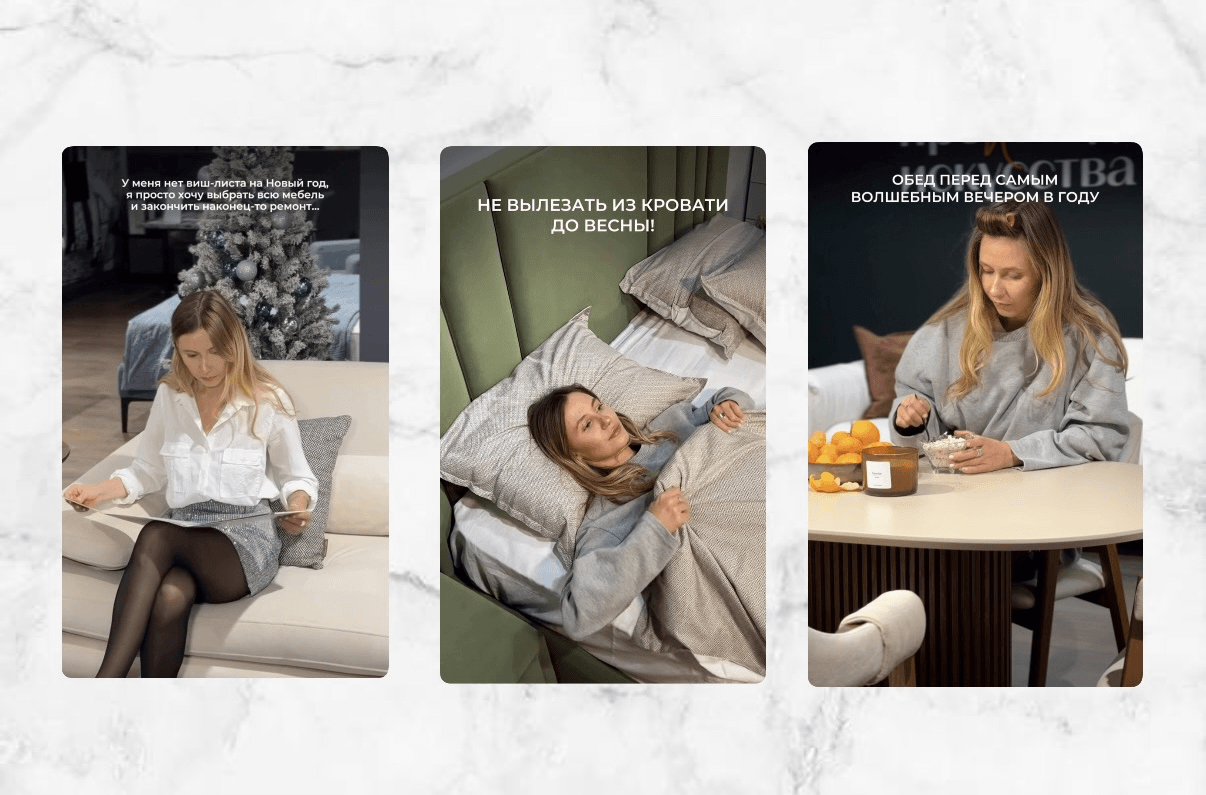 Что сработало: клипы с эмоциональными текстами про уют («декабрь начинается не с ёлки, а с вещей, к которым хочется прикасаться») и короткие ролики с обзорами трендовых моделей.