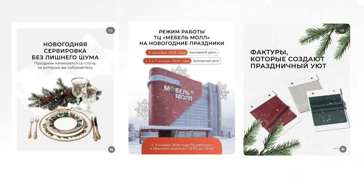 Мы провели тотальную перезагрузку контент-стратегии. Вместо скучных постов о диванах мы сделали ставку на эмоции, новогоднее настроение и виральные короткие видео. Акцент сместили с «продажи мебели» на «создание уюта».