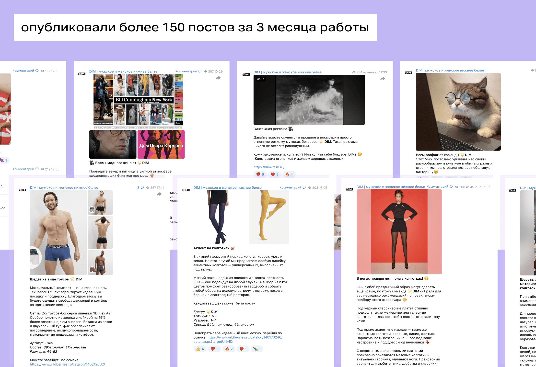 Продающие посты создавались в формате визуальных витрин и мини-презентаций продукции. Мы выделяли ключевые преимущества моделей DIM (эргономика, ткани, дизайн), добавляли call-to-action и прямые ссылки на сайт и маркетплейсы. Публикации стимулировали переходы и способствовали росту конверсии.