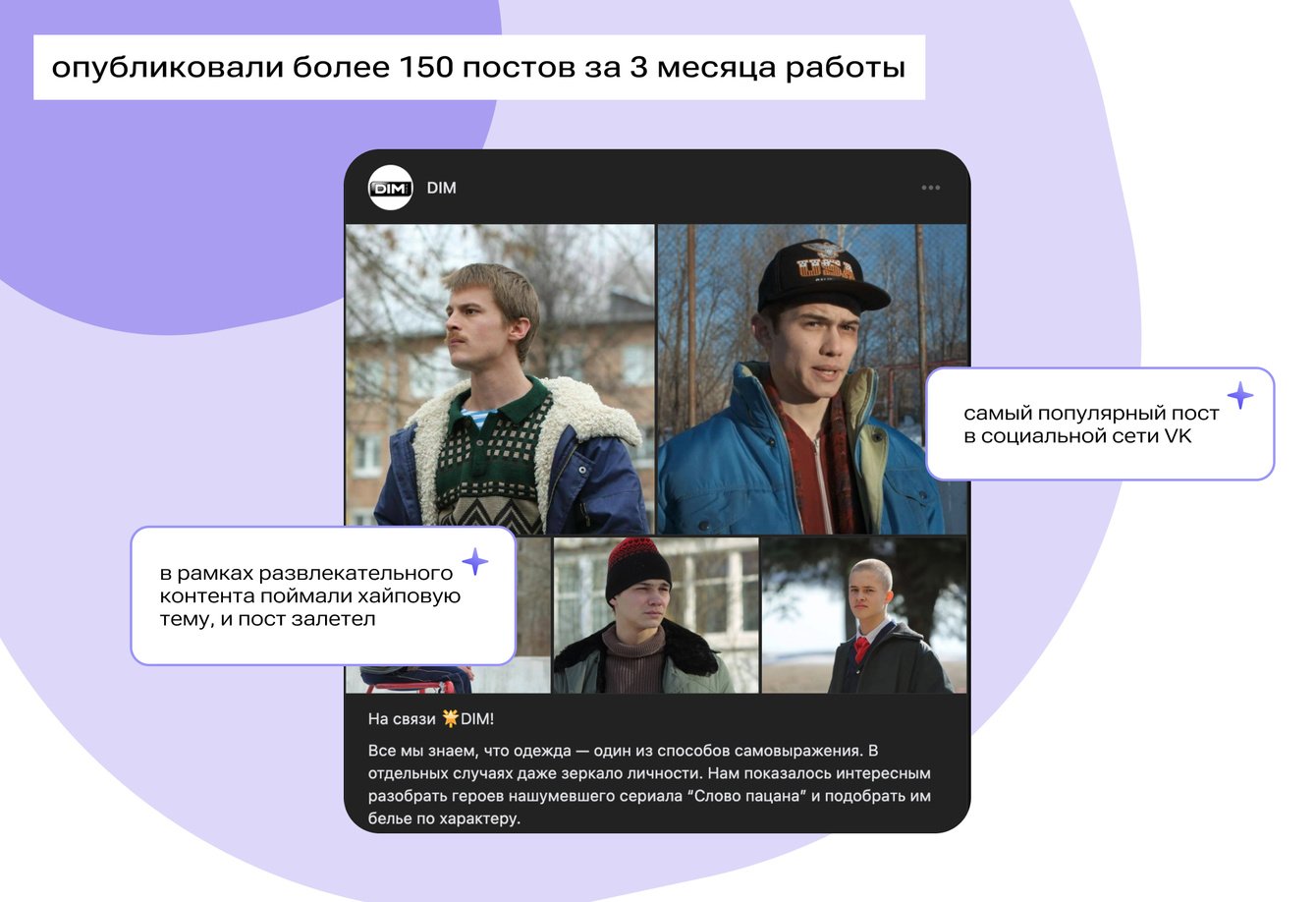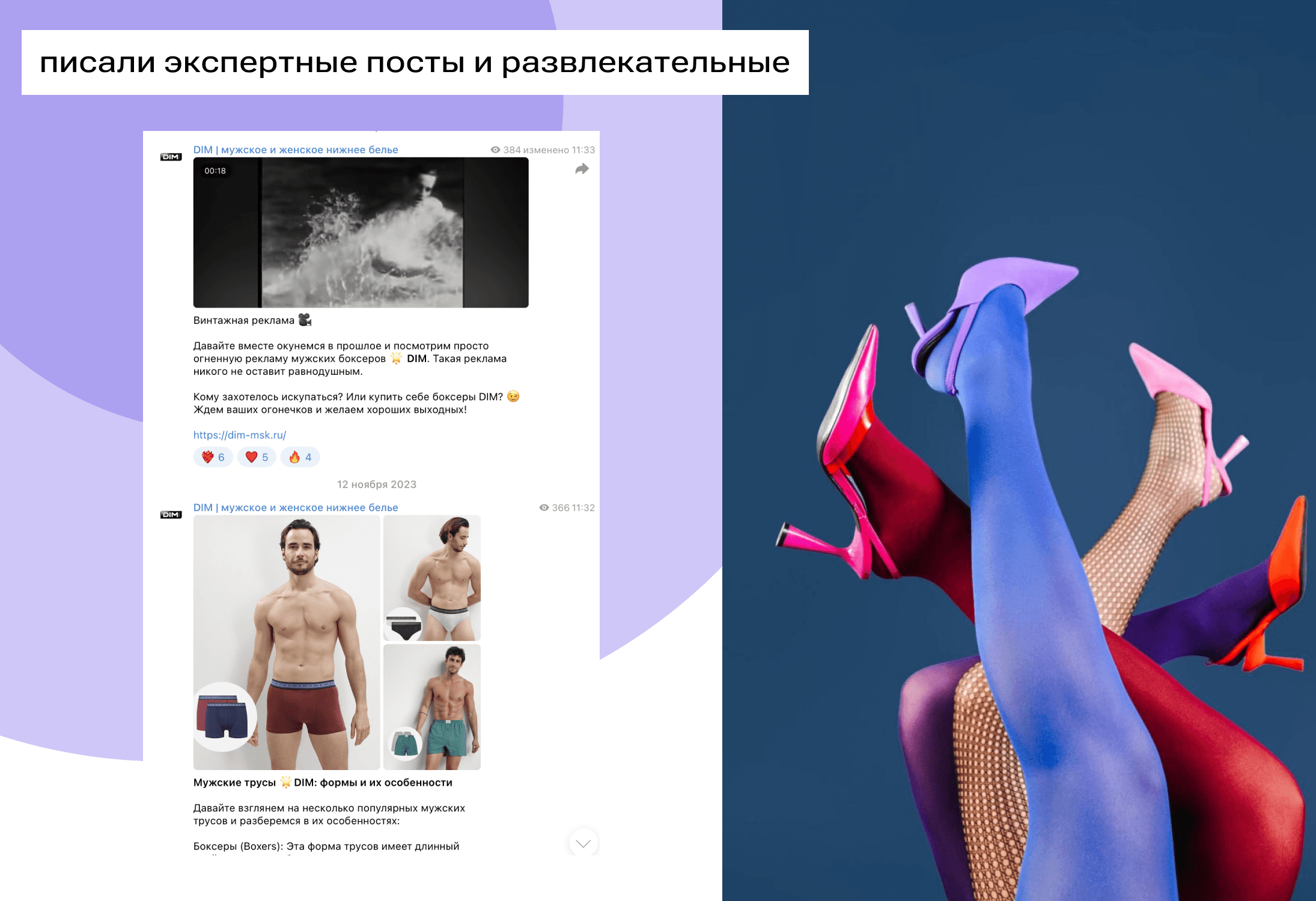 Выстроили системный контент-план с ежедневными публикациями в VK и Telegram на три месяца работ. Формат обеспечил стабильное присутствие бренда в ленте пользователя и позволил формировать устойчивую ассоциацию DIM с качеством, комфортом и французской элегантностью.