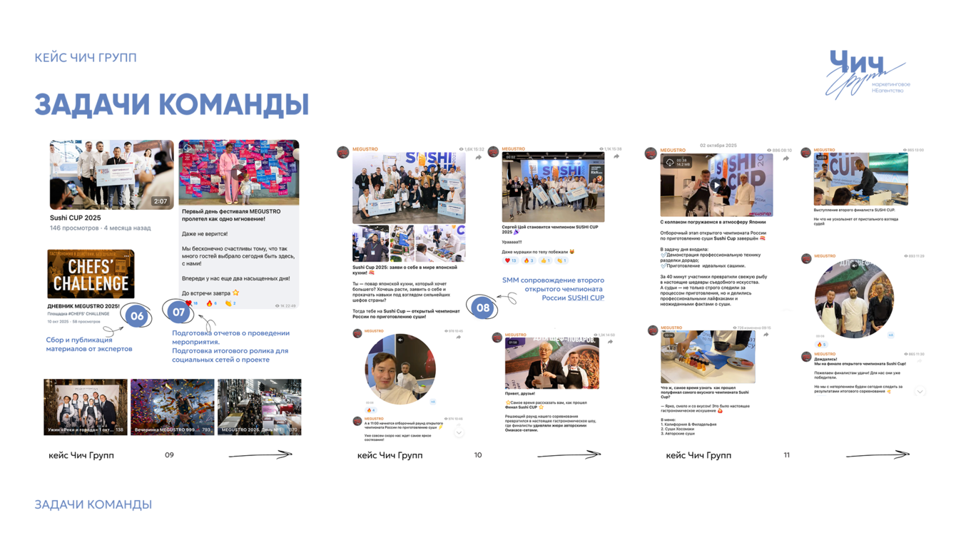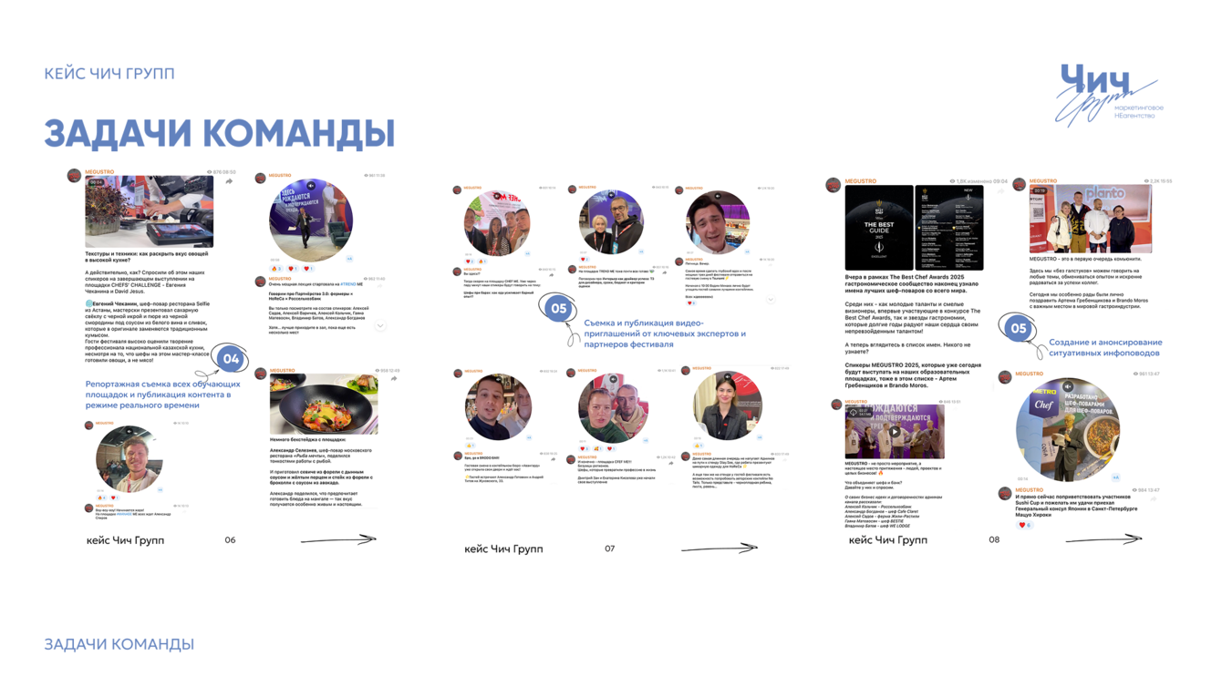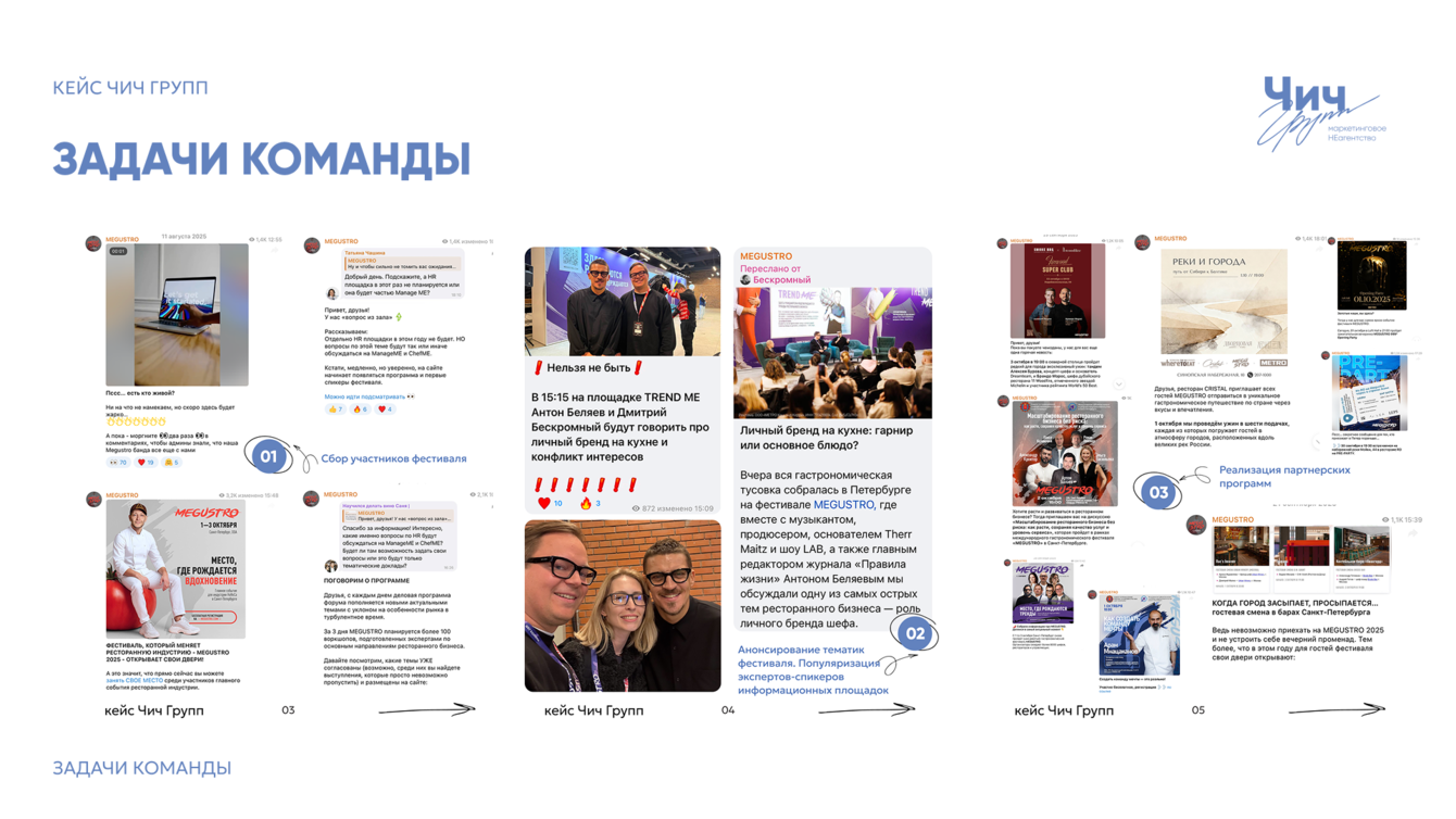 Уже в 9 раз гастрономический фестиваль MEGUSTRO собирает в Санкт-Петербурге сотни представителей ресторанной индустрии: шеф-поваров, рестораторов, поставщиков и ведущих экспертов HoReCa (индустрия гостеприимства и общественного питания). Но за атмосферой большого профессионального события всегда стоит большая digital-работа. В 2025 году наша команда Чич Групп сопровождала соцсети фестиваля в течение 3 месяцев – от первых анонсов до итоговых материалов после закрытия. Период сопровождения: 3 месяца (август–октябрь 2025). Ключевые каналы коммуникации: Telegram и ВКонтакте.
