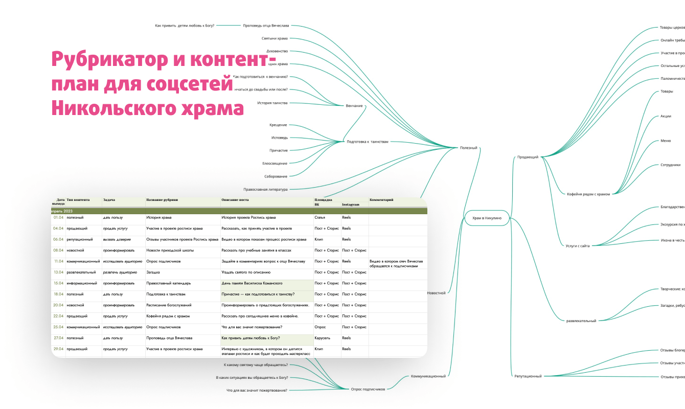Работу мы, как обычно, начали с рубрикатора, в котором выделили 5 типов контента: полезный, новостной, коммуникационный, продающий и репутационный. Для каждого типа контента предложили названия рубрик и темы для постов, которые сформулировали благодаря анализу и во время поездки в храм.
