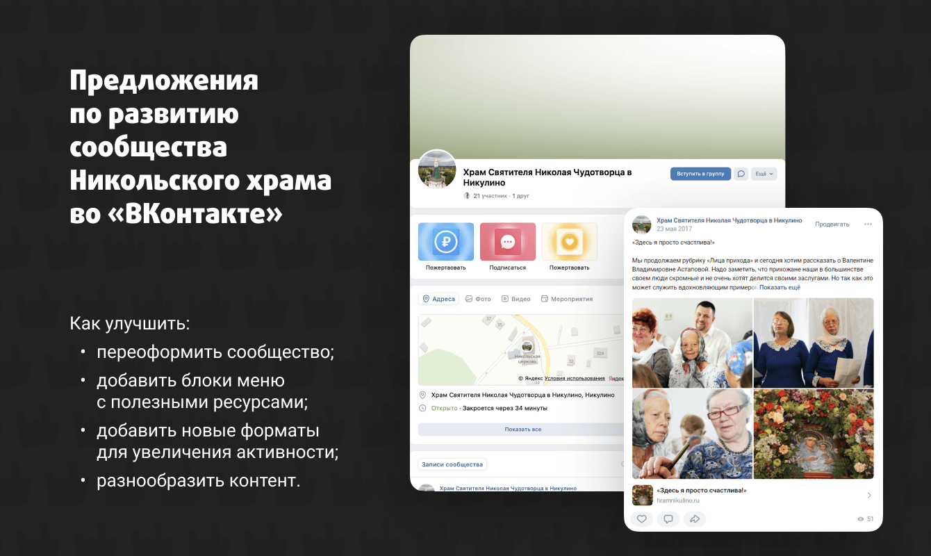 Защита стратегии прошла успешно, практически сразу контент-менеджер заказчика переоформил сообщества храма в Никулино и выпустил первые посты с новым визуалом.