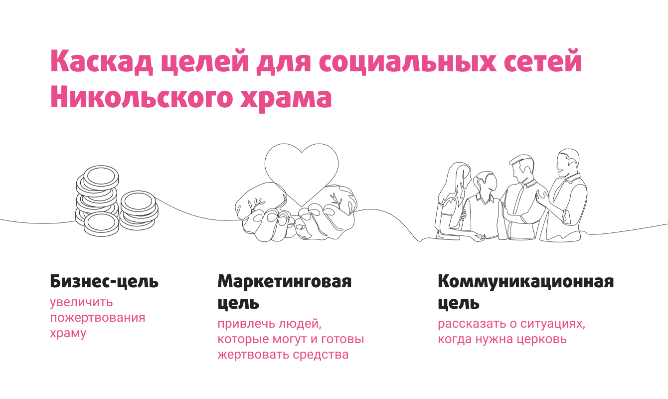 Первый шаг — определение целей. Для храма их тоже стоит разбить на три группы, чтобы получить так называемый каскад целей: для бизнеса, маркетинга и коммуникации.
