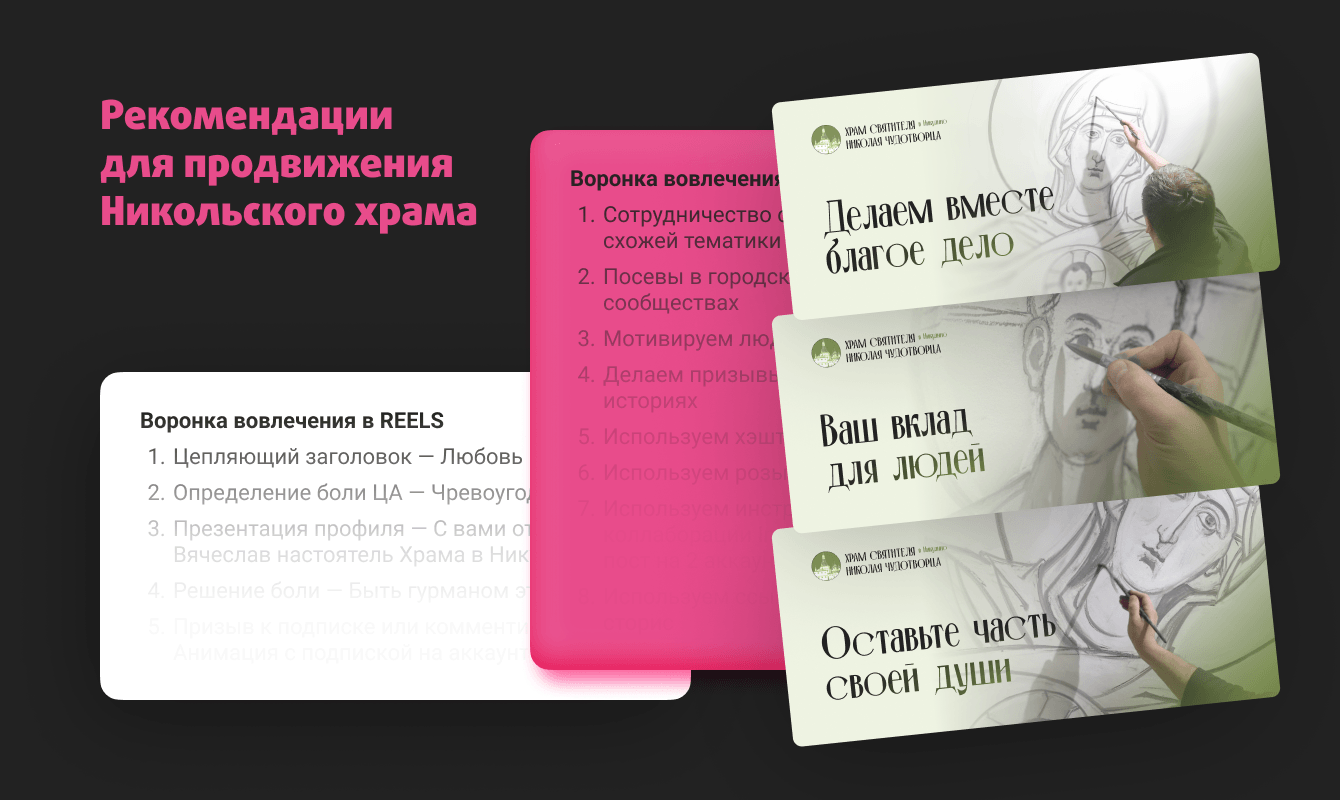 • воронку вовлечения для Reels (от знакомства с храмом до целевого действия);