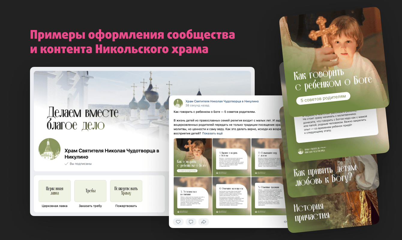 Защита стратегии прошла успешно, практически сразу контент-менеджер заказчика переоформил сообщества храма в Никулино и выпустил первые посты с новым визуалом.