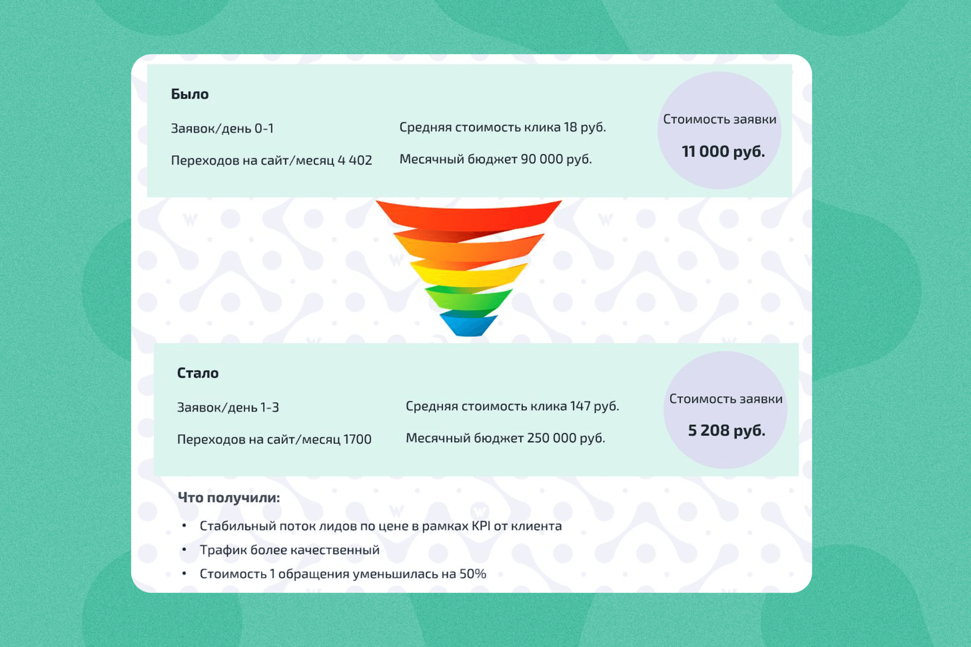 Компания-провайдер казначейского сопровождения госконтрактов и гособоронзаказа столкнулась с чрезмерно дорогими лидами (10 000–12 000 ₽ за обращение) при работе с другим подрядчиком. Задача ― снизить стоимость заявки, сохранив стабильный поток обращений.
