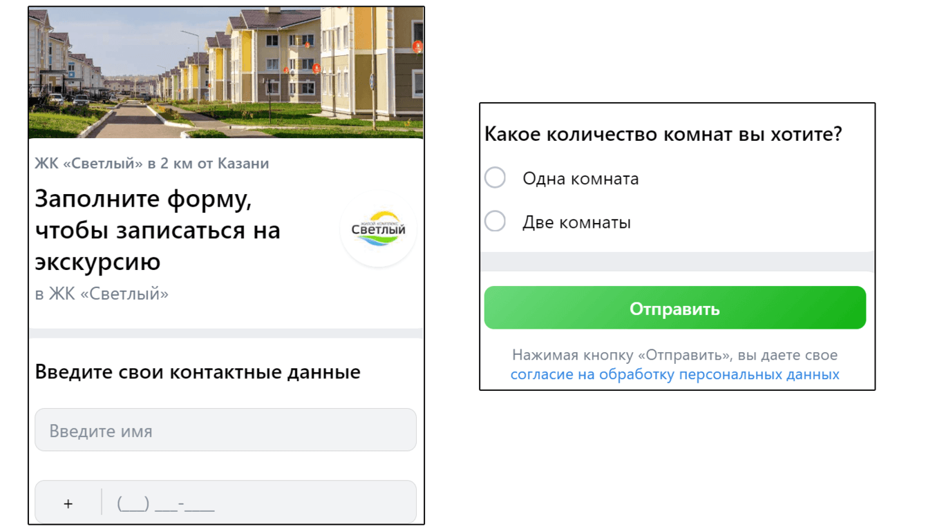 Форма включала всего 3 обязательных вопроса: имя, номер телефона и желаемое количество комнат. Это способствует заполнению формы до конца: чем меньше полей, тем выше вероятность, что пользователи ответят на все вопросы.