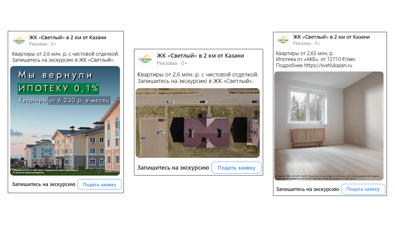 Разработали несколько разных креативов для рекламной кампании. В некоторых сделали упор на ипотечный платеж, чтобы попасть в потребность эконом-аудитории, в некоторых отразили преимущества экологичности и близости к природе. В большинстве текстов отразили «чистовую отделку» и низкую цену как ключевые преимущества. Тестировали и объявления с видео.