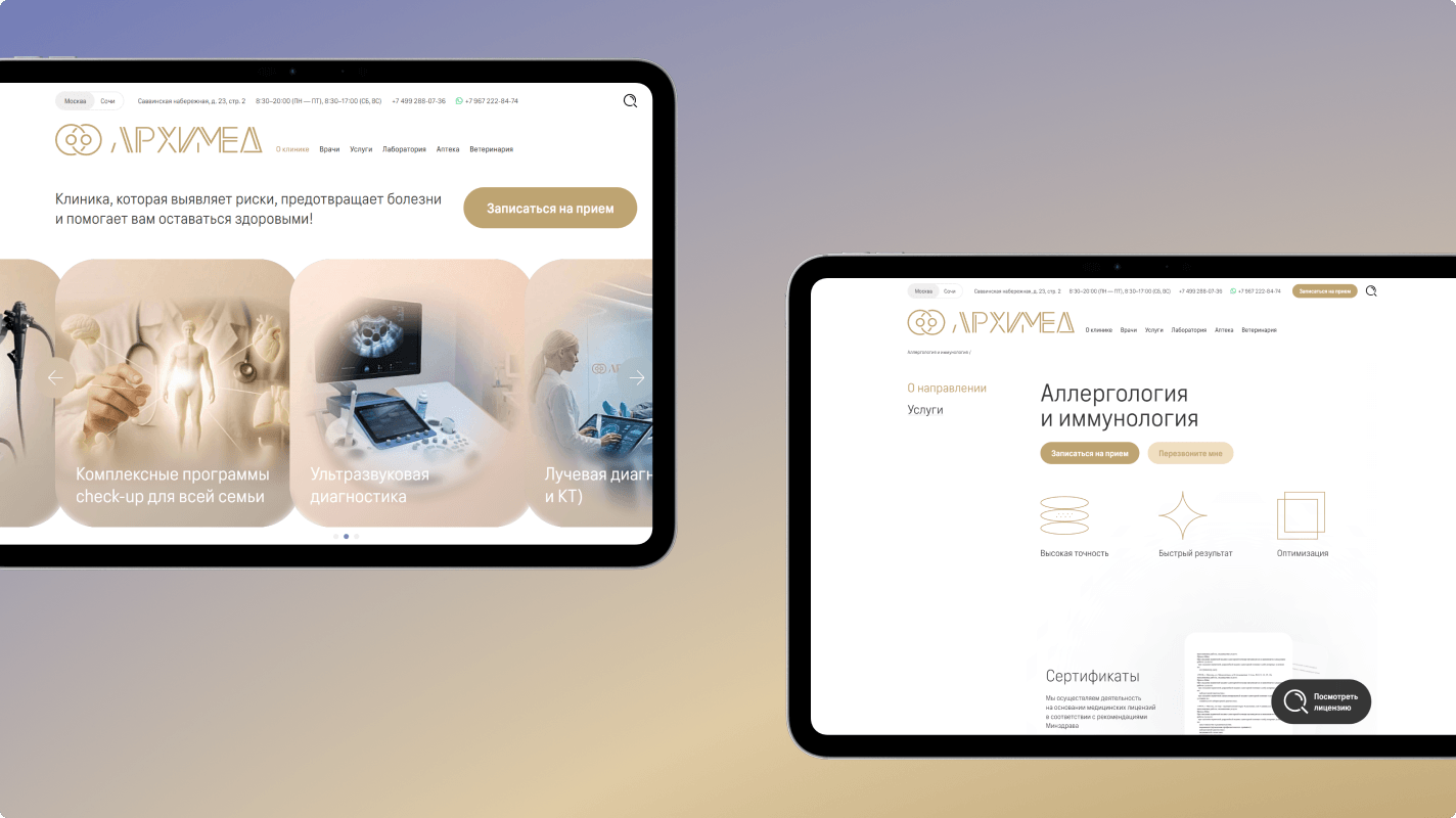 Чем современнее медицинская клиника, тем современнее должен быть и сайт. Для этого клиника «Архимед» обратилась за дизайном новых страниц в Студию Артемия Лебедева. Мы, как партнеры студии, взяли на себя верстку и обновление сайта на 1С-Битрикс.