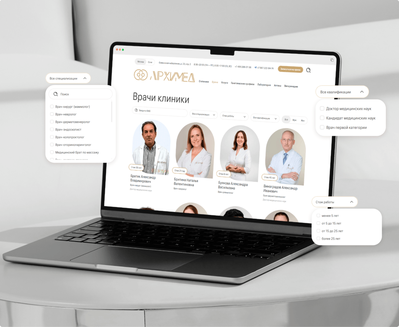 Добавили новые фильтры на странице всех врачей. Фильтры позволяют подобрать врача по специализации, стажа работы и центру компетенций. На поиск подходящего врача уходит несколько секунд.