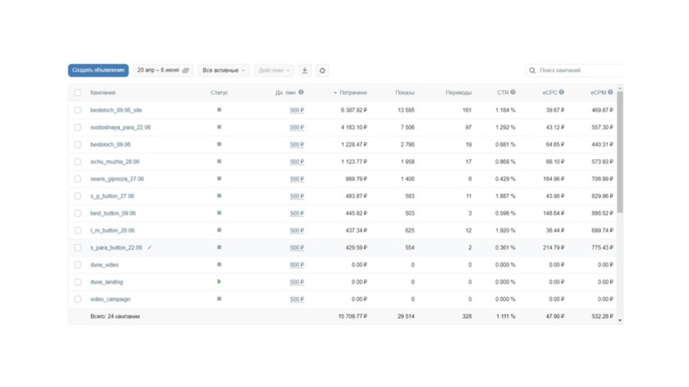 1. Ограниченный рекламный бюджет. Мы впервые запускали рекламу для этого клиента в кабинете PRO — у нас не было статистики, от которой можно было бы оттолкнуться. Мы проводили много тестов с аудиториями и таргетингами, и это тестирование осложнял скромный бюджет. В результате мы оставили наиболее эффективные кампании, остальные отключили. Не исключено, что с увеличенным бюджетом мы нащупали бы лучшую связку «креатив — аудитория — таргетинг».