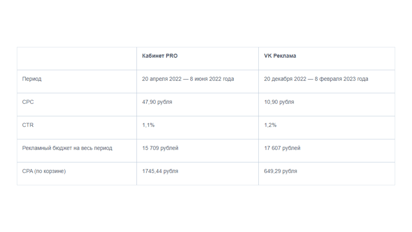 1. Вернуться к рекламе ВКонтакте было правильным решением, несмотря на то что весной 2022 года показатели CPC и CPA заказчика не устраивали. Это говорит о том, что забрасывать казалось бы неработающие рекламные каналы неправильно — лучше возвращаться к тестированию через время и повторно оценивать результаты, ведь всё могло измениться.
