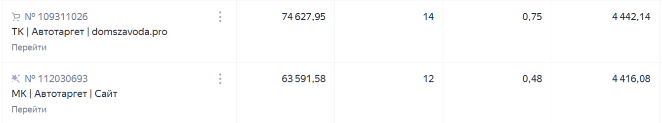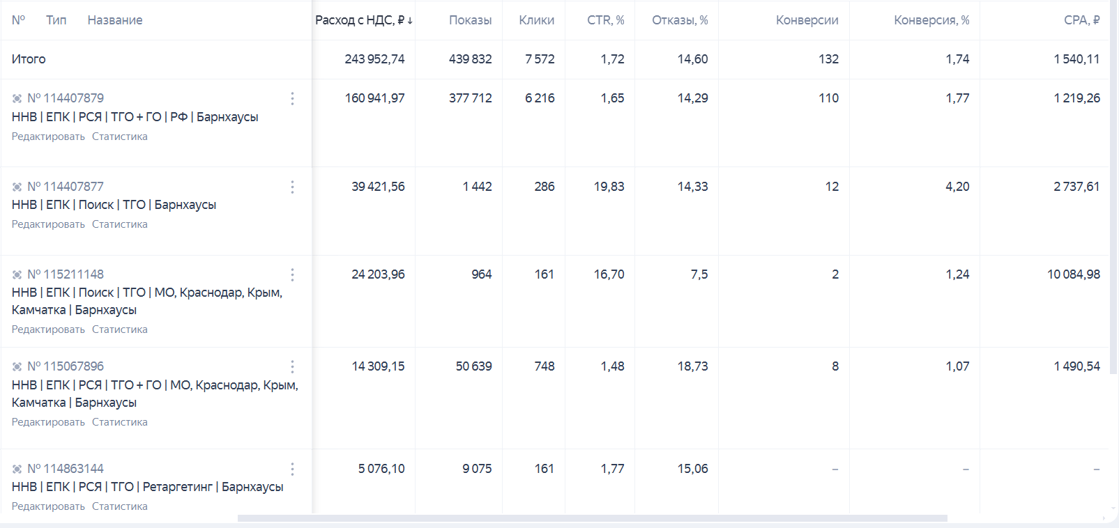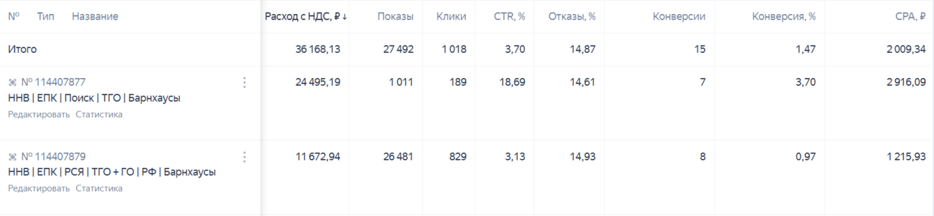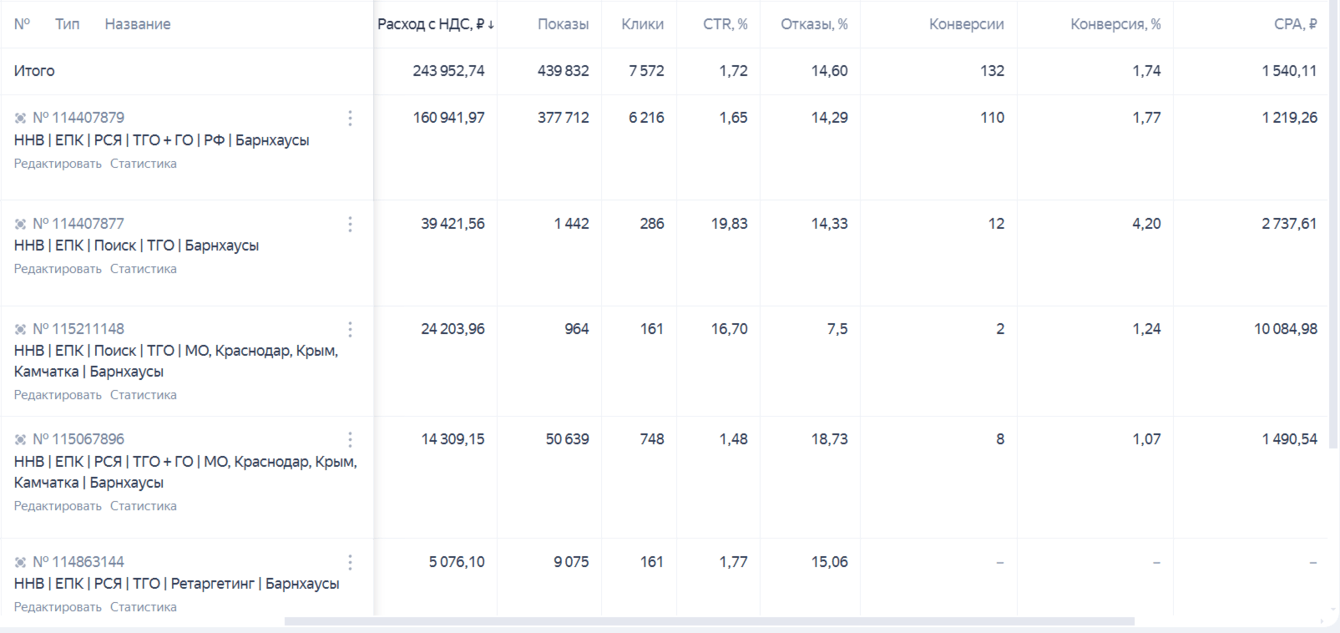 Такие кампании работали у прошлого подрядчика (крайняя колонка — CPA):
