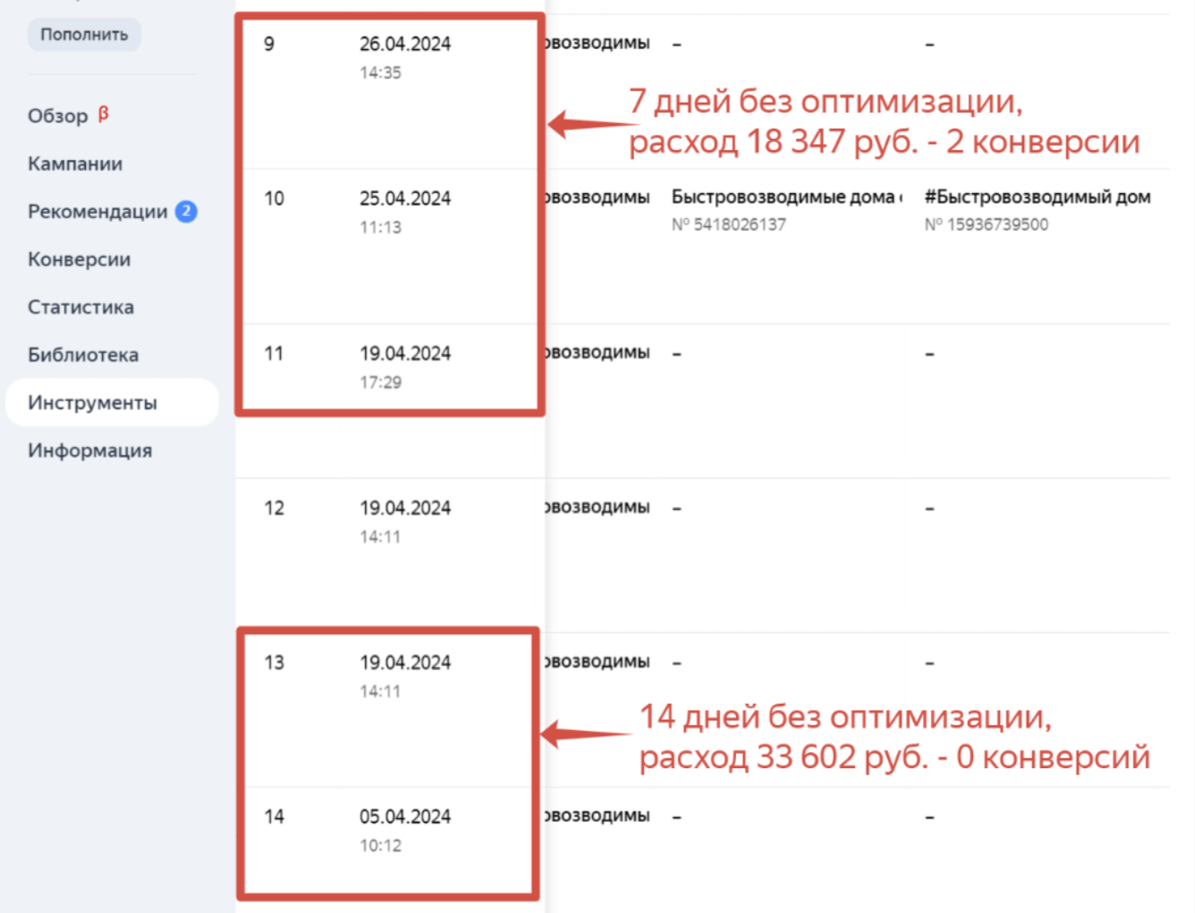 — Отсутствие регулярного анализа данных, а также редкая оптимизация рекламных кампаний (всего лишь раз в неделю!)