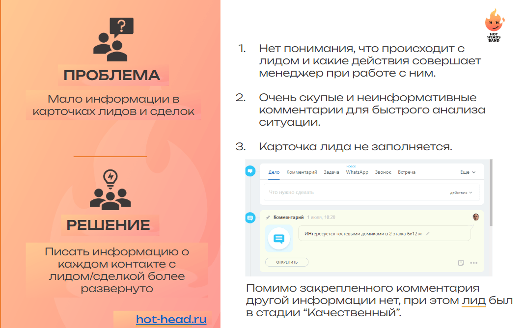 — необходимость писать комментарии о каждом контакте с лидом более развернуто;