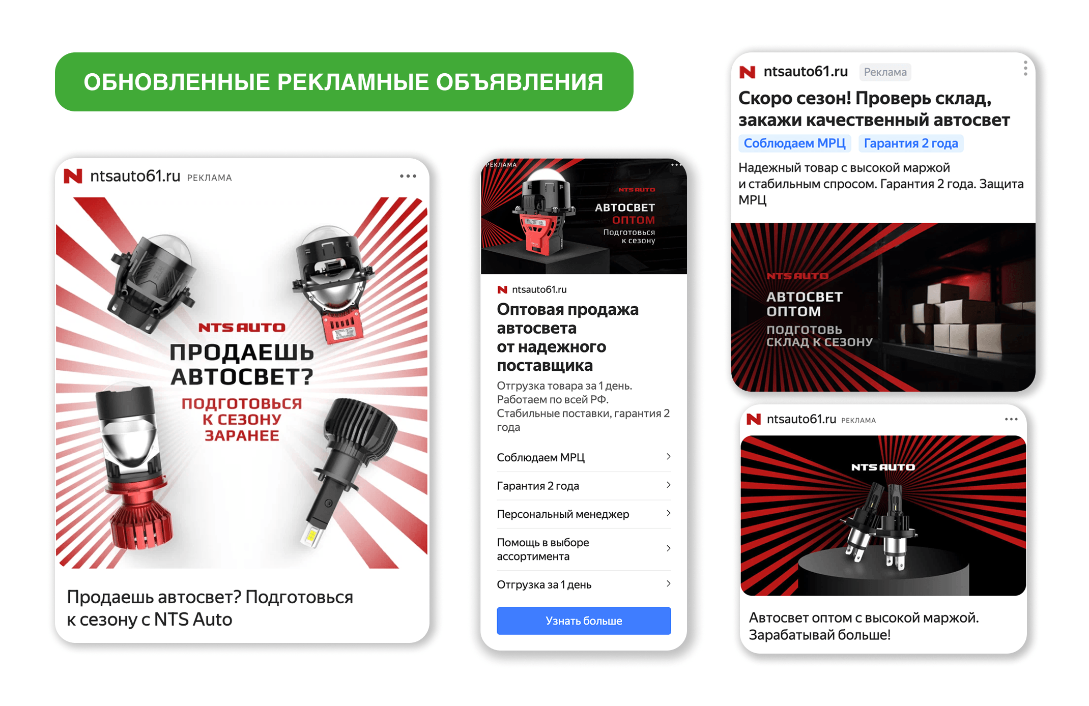 Были разработаны новые элементы рекламных объявлений с акцентом на те преимущества, которые важны для оптовой аудитории: высокую маржу, соблюдение МРЦ, гарантию 2 года, стабильные поставки и персональное сопровождение. Параллельно был подготовлен отдельный оффер под период межсезонья — с акцентом на подготовку ассортимента и склада заранее, чтобы дополнительно простимулировать оптовых клиентов к закупке до начала активного сезона.
