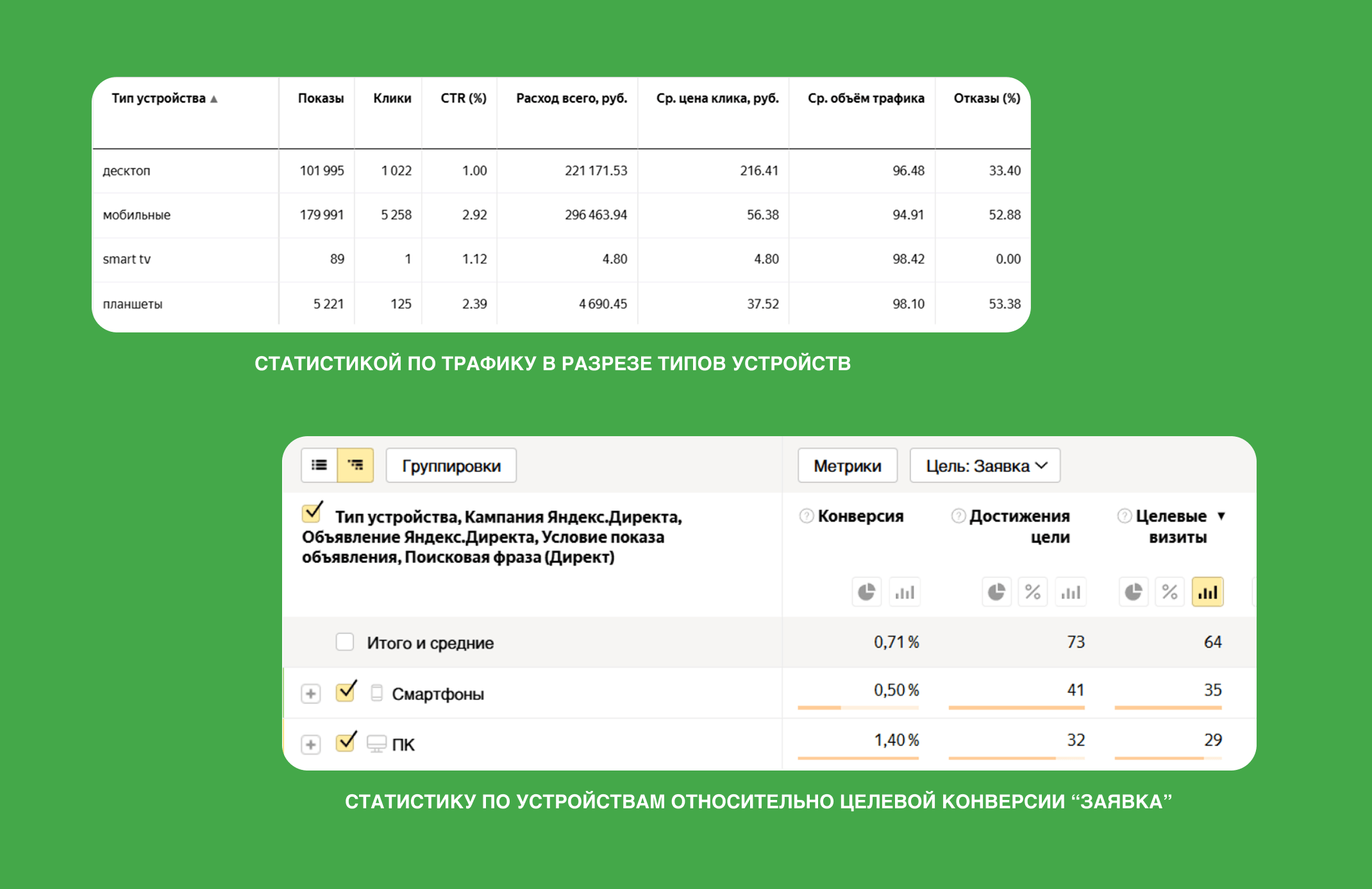 Анализ трафика по устройствам показал, что основной объем переходов в оптовом направлении приходился на мобильные устройства — 5 258 кликов, и с них же было получено больше заявок — 41. При этом показатель отказов достигал 52,88%, тогда как на десктопе он составлял 33,40%, а конверсия в заявку была выше и составляла 1,4%. Основной объем переходов и заявок в оптовом направлении обеспечивали мобильные устройства, но более высокий показатель отказов указывал на необходимость доработки мобильной версии лендинга и повышения юзабилити сайта.