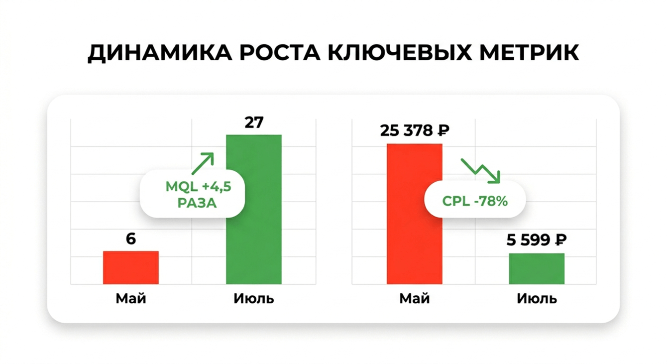 За период с мая по июль 2025 года проект прошел путь от дорогой и нестабильной лидогенерации к эффективной модели продвижения оптового направления. Если в начале периода реклама приносила 6 обращений по 25 378 рублей, то в июле было получено 27 обращений по 5 599 рублей.