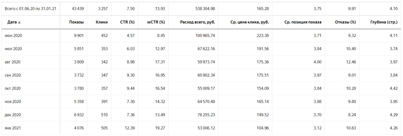 Анализируемый период работы с РК: июнь 2020 – январь 2021 год.