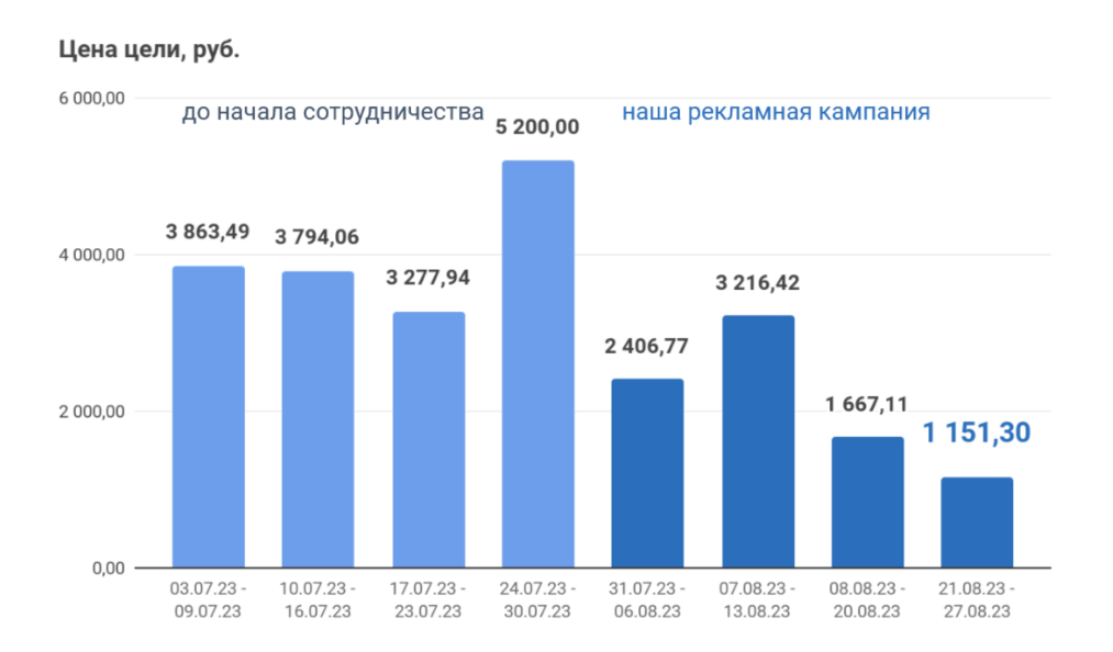 На графике видно, что в первый же месяц работы нам удалось снизить стоимость конверсии на 71%.