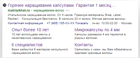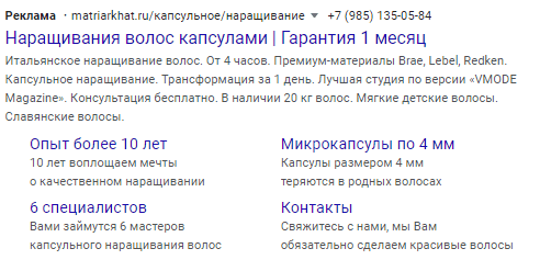 Добавлены: уточнения, быстрые ссылки, описания БС, отображаемая ссылка, визитка в Яндекс.