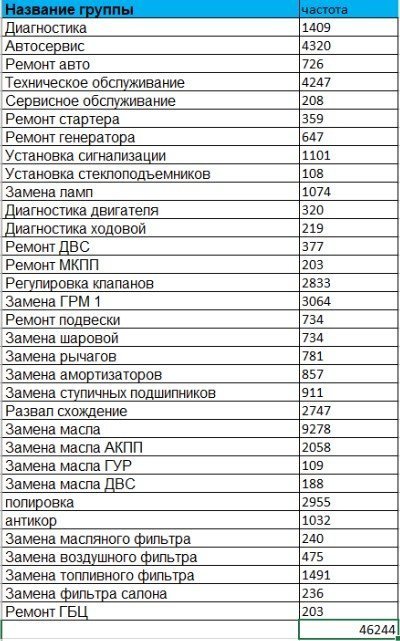 На первом этапе мы сделали прогноз по запросам услуг автосервиса по всем маркам авто. Сразу же поняли, что не потянем такой объем запросов (общее число в мес около 46 244) с бюджетом меньше 50 т.р в личный кабинет Яндекс.
