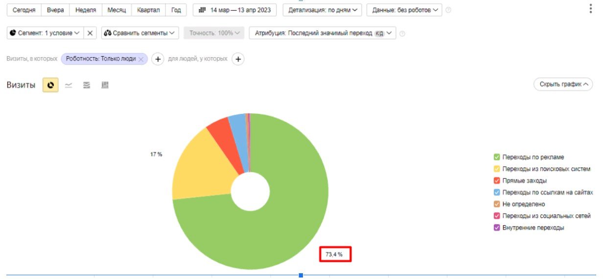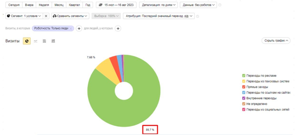 Все проводимые нами оптимизационные действия показали отличный результат. Если в первый месяц с рекламы пришлось 73,4% трафика на сайт, то за последний месяц при текущем бюджете удалось привести 85,7% от общего количества трафика (1,2 фото)
