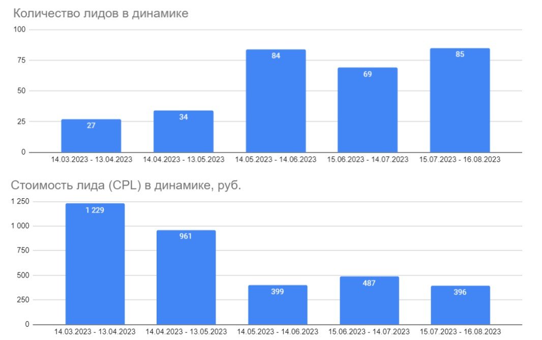 За первый рекламный период получили 27 целевых обращений, стоимостью 1 229 руб. План выполнили, но теперь необходимо было предпринимать меры по оптимизации и снижению стоимости лида.