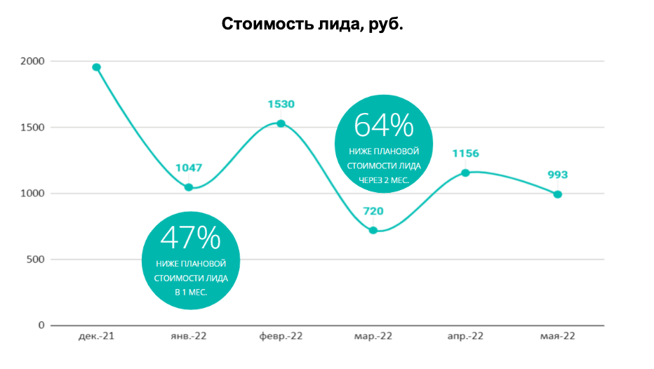 ● Последующие месяцы. Оптимизация проекта и аккуратное тестирование новых гипотез на небольших бюджетах, чтобы поддерживать стоимость лида на достигнутом уровне и постепенно продолжать снижать ее.