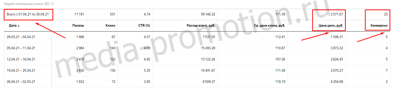 В период с 1 по 30 апреля было - 23 заказа по 2570 рублей заявок и было принято решение проверить эффективность всей комплексной работы маркетинга, а именно работу и адаптивность сайта, а потом уже настраивать на него рекламу в Яндексе.