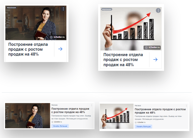 Объявления разделены на 2 категории устройств десктопные и мобильные. Для а/б теста добавлены 2 варианта изображения.