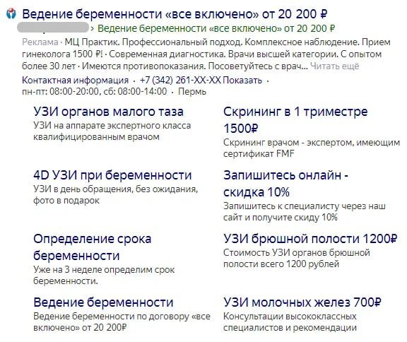 Гинекология + УЗИ малого таза. Это ключи, содержащие в себе как общие запросы вроде «гинеколог пермь», «гинеколог-эндокринолог пермь», «гинекология пермь», «узи малого таза пермь», так и более узкие, например, «ведение беременности пермь платно», «гистероскопия пермь платно»