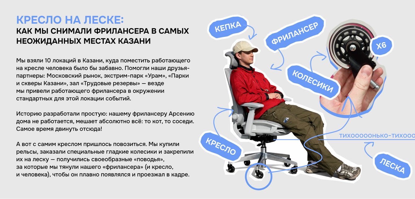 Мы выбрали 10 знаковых и неожиданных локаций Казани: от Московского рынка и пляжа до экстрим-парка «Урам» и баскетбольного зала. Это позволило создать комедийный контраст между сосредоточенным фрилансером и суетой вокруг.