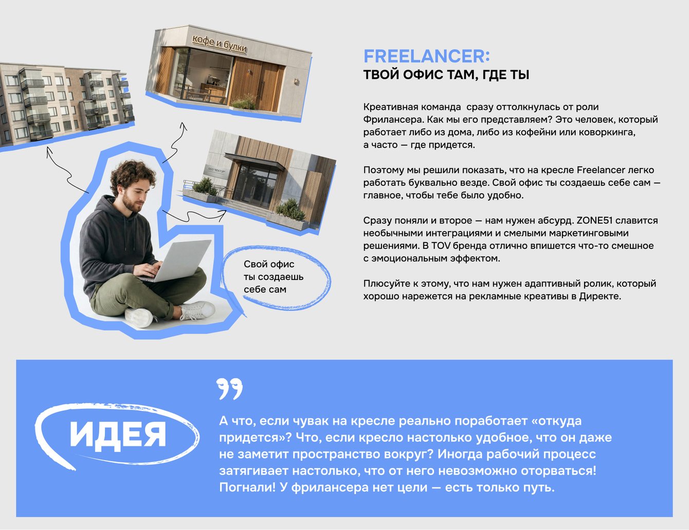 Контекст: Бренд ZONE51 — признанный лидер в геймерской среде, известный своими смелыми маркетинговыми решениями. Задача состояла в запуске новой флагманской линейки кресел Freelancer, созданной не только для геймеров, но и для широкой аудитории — фрилансеров и всех, кто ценит комфорт при долгой работе.