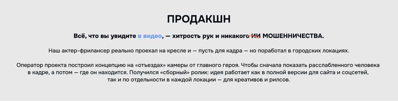 Весь продакшн изначально планировался как конструктор. Ролик легко разбирается на короткие сегменты под каждую локацию для использования в соцсетях и рекламных кампаниях.