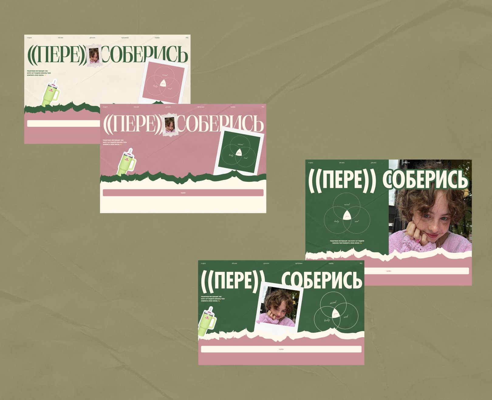 В этот раз у клиента было очень четкое видение компонентов дизайна (коллажные вырезки, цвета и тд), поэтому мы сразу приступили к вариантам концепций из всего того, что уже нравится клиенту