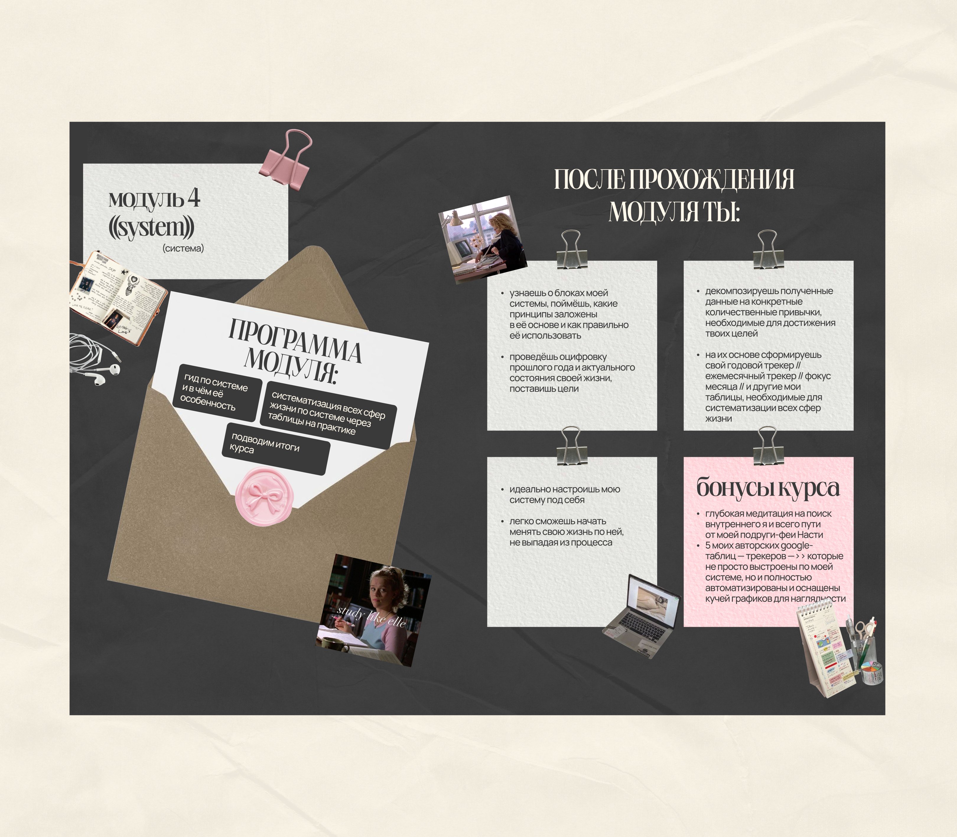 После анализа ЦА, у нас уже были четкие портреты и боли пользователей, их мы показали в отдельном блоке "для кого курс". В нем также есть вырезки из любимых фильмов и мультиков автора курса, что еще больше предает ее вайб на сайте, отражает ее взгляды и привлекает тех, кому по душе эта эстетика