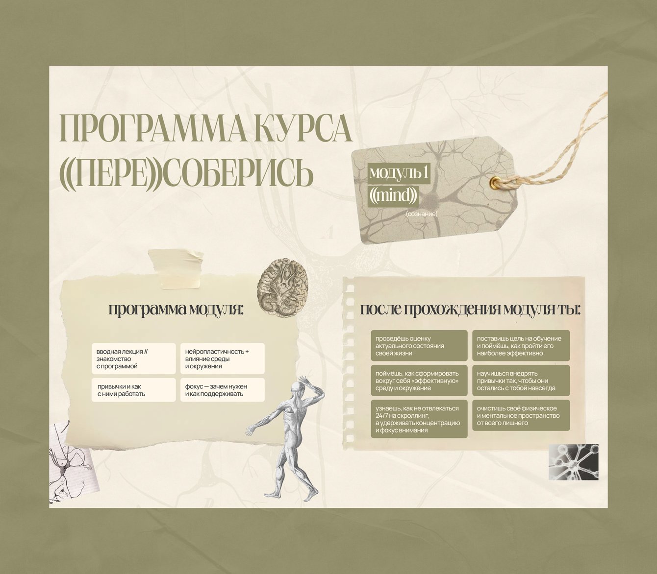 Он про сознание и реальные научные методы. В оформлении мы использовали вырезки из настоящих медицинских книг, на фоне текстура нейронных связей и будто состаренные бумажки
