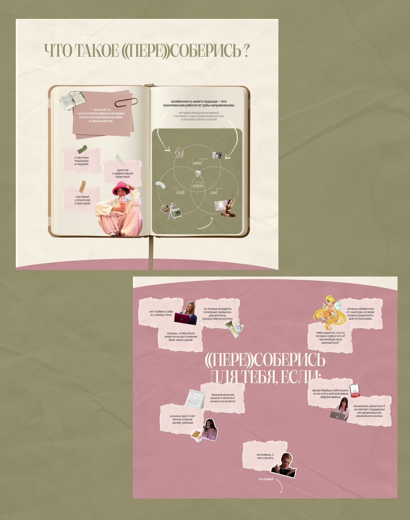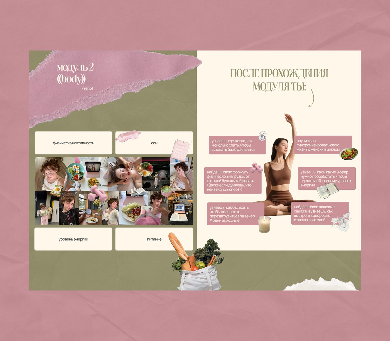 Про питание, сон и гармонию со своим телом. Добавили вырезки еды, спорта и коллаж из живых, настоящих фото Лизы (опять же для сближения с пользователем)