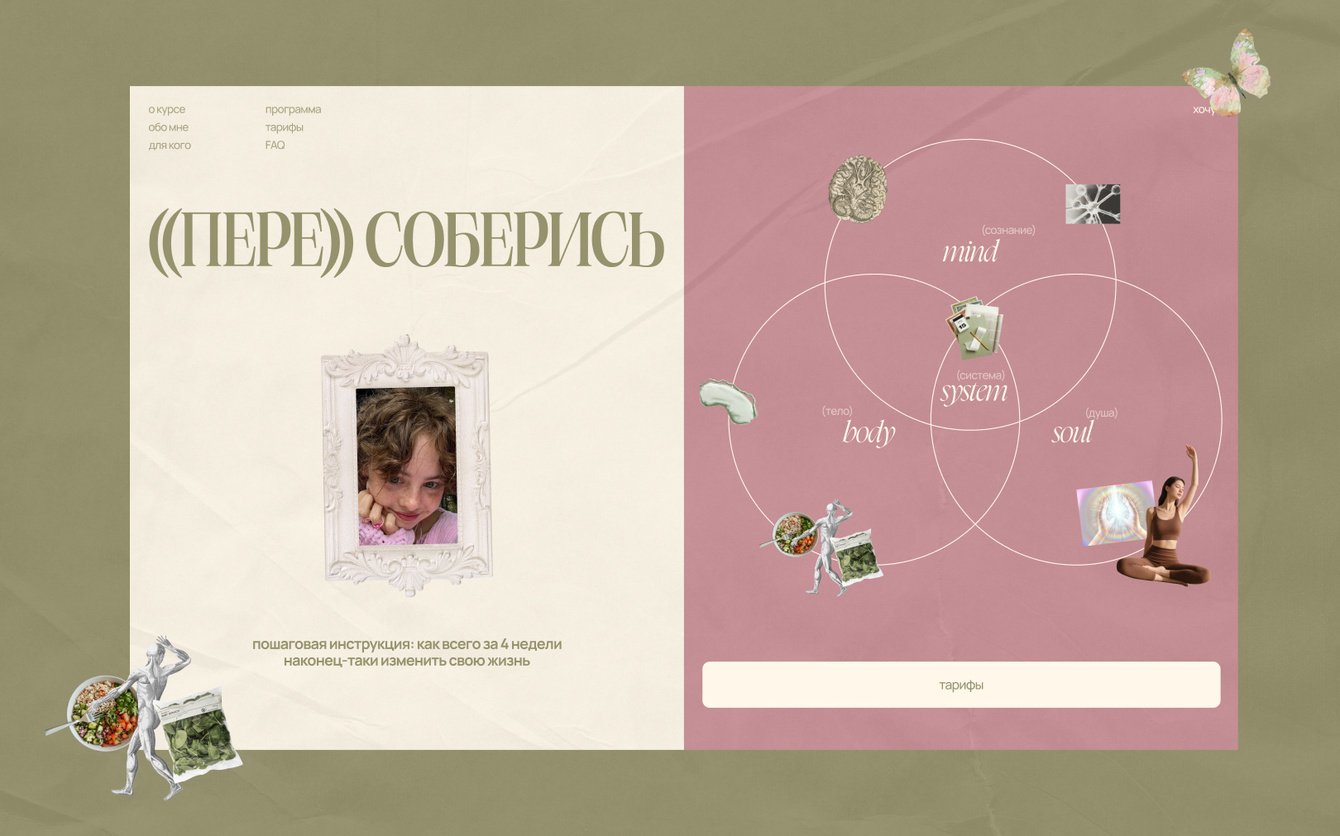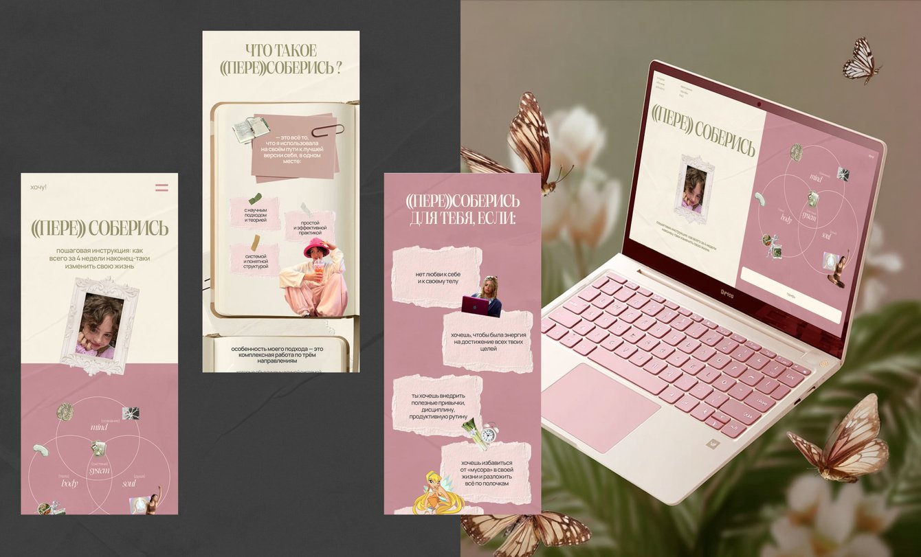 К нам обратилась популярная блогерша Лиза @moilizochek (аудитория 200К+ в соцсетях) за созданием сайта для своего флагманского курса ((пере))соберись