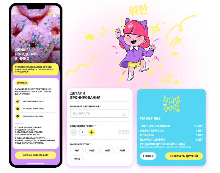Для планирования празднования дня рождения в ресторане создан специальный интерфейс, где можно забронировать стол на нужное кол-во человек, внести предоплату, выбрать праздничный набор (например, торт со свечей и украшения, а также подарок для именинника). Можно указать особые пожелания и выбрать доп.услуги.