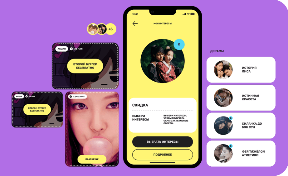 В приложении можно выбрать интересы, которые, как и тематика ресторанов, привязаны к K-POP культуре. На основе этих интересов приложение предлагает повышенный кэшбэк.