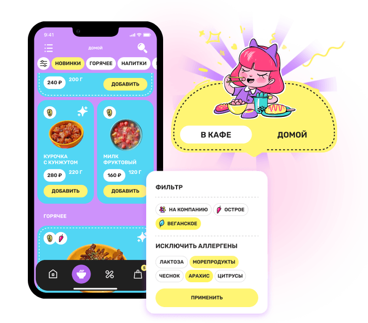 Яркий каталог с позициями меню делится на 2 категории – в кафе (заказ с самовывозом) и домой (доставка на адрес). Кроме подразделов по типу блюд (горячее, напитки и т.д.), ориентироваться в меню помогают фильтры/лейблы – на компанию, острое, веганское. А также можно исключить из списка блюда с определенным аллергеном.